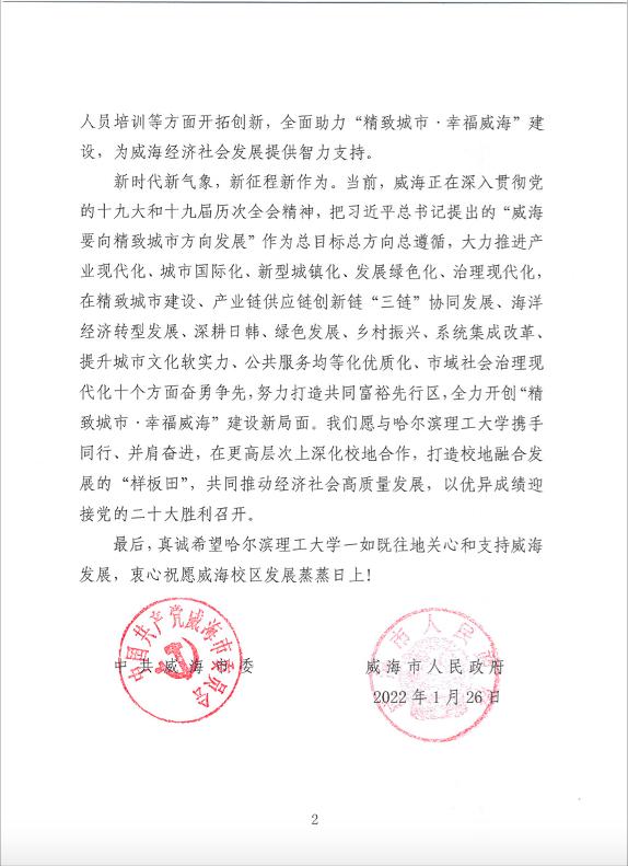 2022年1月,中共威海市委市政府给我校发来感谢信。