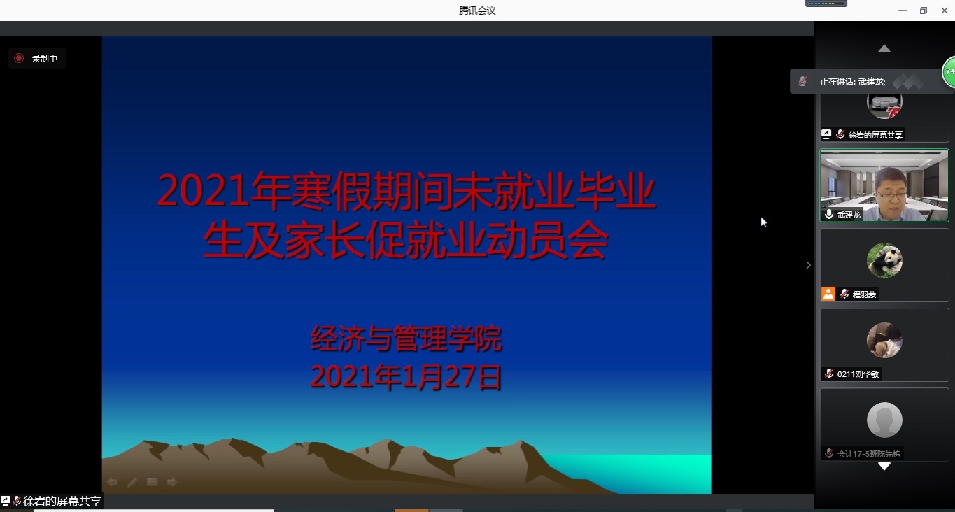 1月27日晚7点,经济与管理学院在线上组织召开2021届未就业毕业生及家长促就业动员会。学院院长武建龙、党委书记周长群、副书记徐岩、全体辅导员、毕业生代表、企业招募专家、2021届正在求职的未就业毕业生(含研究生)及家长等198人参加了会议,会议由党委副书记徐岩主持。