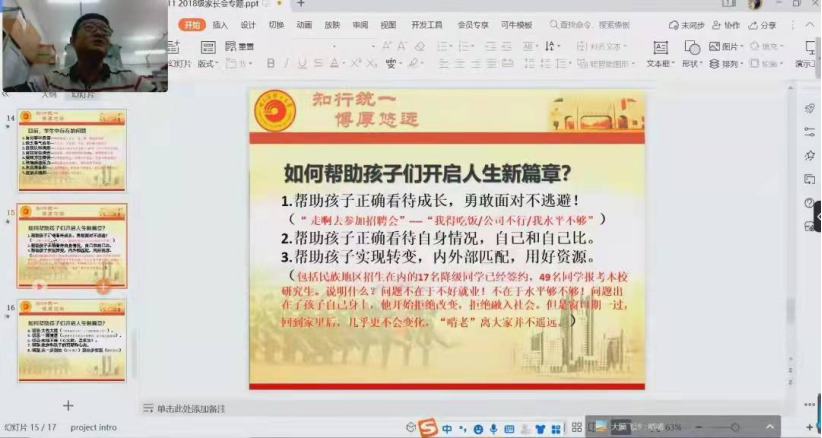 针对家长们普遍关心的学生发展问题,刘鸿图老师从就业市场变化、考研准备、学生存在的问题入手,对家长如何帮助孩子利用这一年实现从“校园人”向“社会人”转变进行了指导,形成家校合力,帮助学生克服疫情影响,实现充分发展。