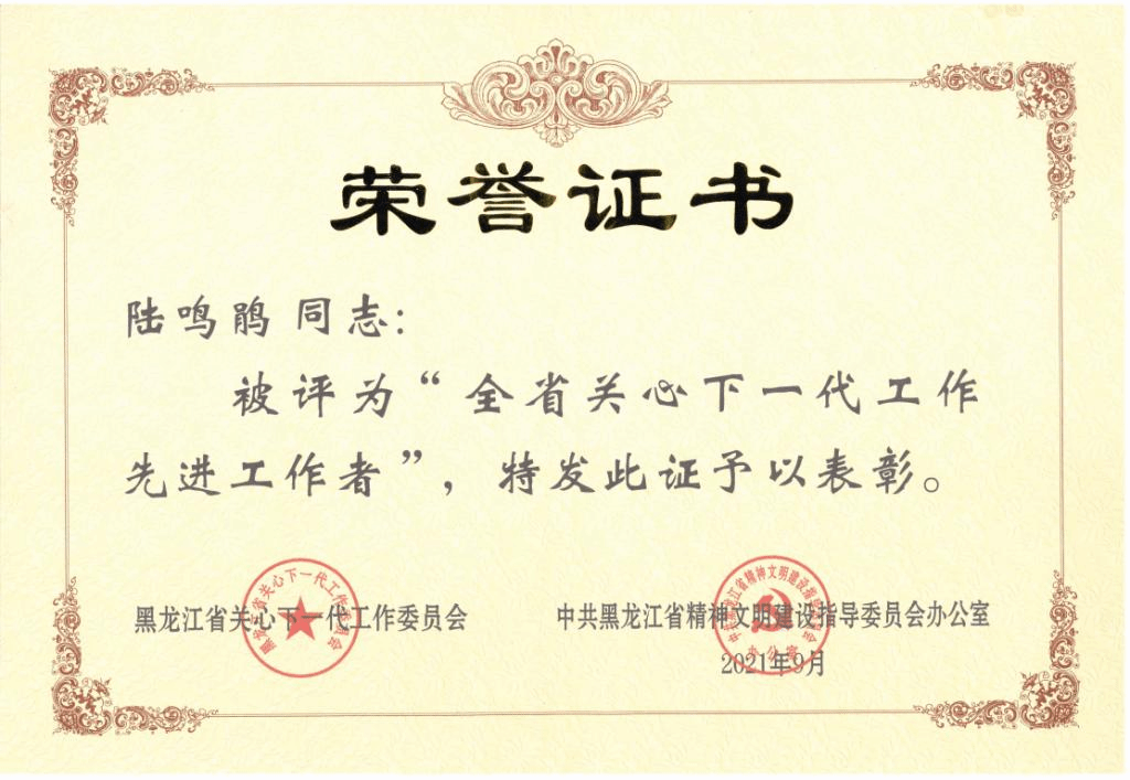 近日,教育部关心下一代工作委员会、黑龙江省关心下一代工作委员会和中共黑龙江省精神文明建设指导委员会办公室分别印发《关于表扬全国教育系统关心下一代工作先进集体、先进工作者和突出贡献者的通报》教关委函【2021】19号,《关于表彰全省关心下一代工作先进集体和先进个人的决定》黑关发【2021】13号,我校邢虹同志荣获“全国教育系统关心下一代工作先进工作者”、陆鸣鹃同志荣获“全省关心下一代工作先进个人”、哈尔滨理工大学机械动力工程学院关工委荣获“全省关心下一代工作先进集体”荣誉称号。