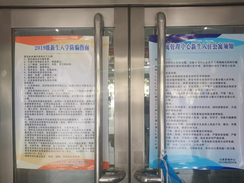 在开学前一周,学生公寓的工作人员再一次对新生寝室及公共区进行了彻底清洁,并对寝室内的设施设备进行了检查。为了更好的让新生们适应公寓生活,每个公寓大厅张贴《新生入住公寓须知》、《新生入学防诈骗指南》、温馨提示等,帮助同学们解决一些日常问题。在迎新生报到期间,为解决新生家庭送子陪同家长住宿问题,学校启动西区体育活动中心作为各学院新生家庭送子陪同家长临时住宿点,免费为新生家长提供100张住宿床铺。