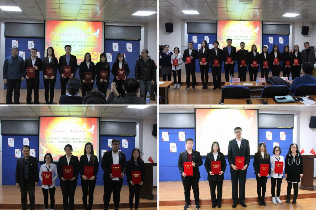 表彰大会还表彰了一批在“不忘初心、牢记使命”主题教育中表现突出的学生党员和党员干部,姚梦雨、赵雪静、程子峰、荣立德、刁鑫宇等11人获得优秀党员荣誉称号,朱乘雪、李佳月、李博琳、于涛源、张婷、赵雪静等6人获得优秀党员干部荣誉称号。食品16-1赵鹏森以8968分的高分获得“学习强国”得分王者团一等奖,研17邓尚和袁丽娜获得二等奖,材化16-1韩玉香、化工16-1刘艺菲、制药16-2朱乘雪获得三等奖。