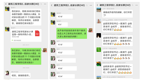 为了更好的让家长了解孩子所学专业和未来发展方向,提升学生学习、考研、创业就业的家庭动力,让教书育人达到老师用心教书,家长潜心育人的融洽的家校互动。12月3日晚20:00由建筑工程学院党委书记戴湘竹主持、辅导员田家助课的首期“家长小课堂”在2018级学生家长微信群中成功举办。本期讲座的学业导师为建筑工程学院土木工程系国家自然科学基金青年项目获得者戎芹博士。