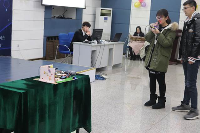 本次大赛经过前期培训、初赛的层层选拔,最终有六组作品进入最终的决赛。在决赛中,各队选手依次上台进行3分钟PPT讲解并演示作品,评委老师根据演示情况对每位选手进行提问并由参赛选手作答。作品中有能进行语音控制的“宿舍助手”和“智能家居系统”,有运用红外线和超声波结合的“寻迹避障小车”,有可实时获取环境参数的“天气助手”以及极具创新的“读谱器”,这些优秀的作品向大家展示着科技的魅力,赢得了台下老师和同学们的一致好评。六组作品展示结束后,孙慧老师对本次大赛做出总体点评,肯定了选手们一个多月的辛勤付出,同时也鼓励同学们要在今后的学习中培养创新意识和求实精神,积极将所学知识应用于实践,努力成为科技创新型人才。