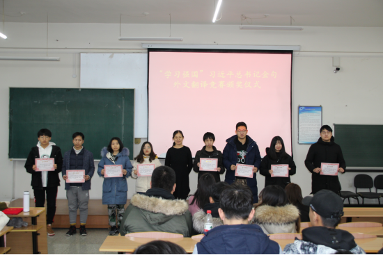 12月23日,为了以赛促学,落实习近平总书记关于学习、关于青年的重要指示精神,培养有理想、有本领、有担当的新时代青年人由教务处、学工处、校团委主办,外国语学院承办的“学习强国”习近平总书记金句外文翻译竞赛颁奖仪式在南区1-544教室举行。外国语学院党委副书记周晓丽出席仪式,并为获奖团队颁奖。
