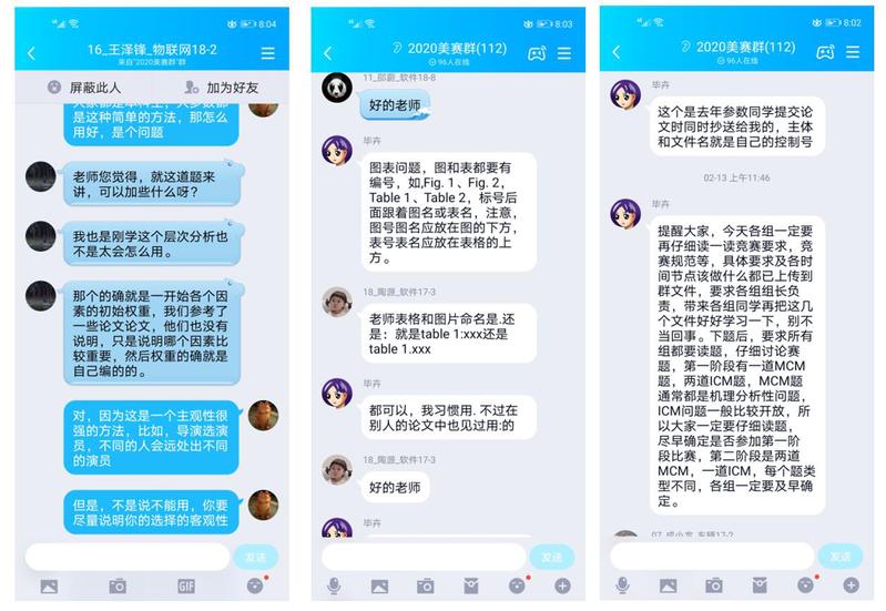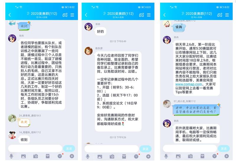 离校不离教,停课不停学。在培训指导过程中,建模团队建立“2020美赛群”,通过网络指导积极跟进,完成了学生第二次优秀论文破解报告的批改并逐一反馈意见、指出不足;并组织学生进行了线上模拟竞赛,帮助学生适应团队远程配合、居家网上参赛的新模式,协助学生完成网上报名,逐队指导参赛学生熟悉参赛要求和论文提交流程,保证各组能独立完成参赛任务。特别是在模拟竞赛期间,指导教师克服困难,全天在线,第一时间指导学生建模及团结合作,对学生撰写论文进行批改和点评,提高了学生建模能力,增强了学生参赛信心!