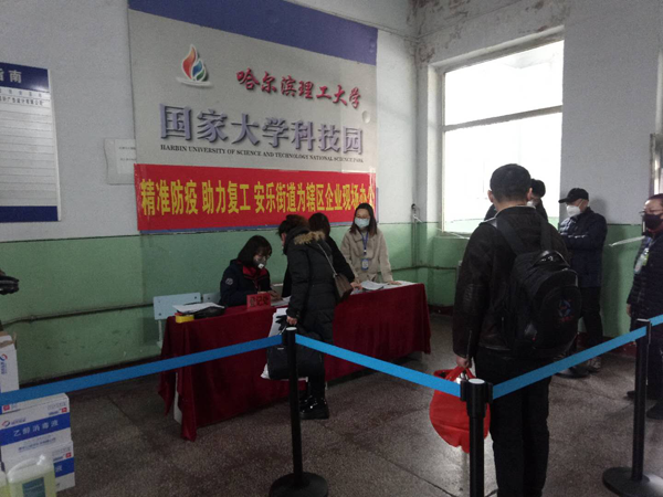 复工当日,香坊区企业复工复产检查组和南岗理工社区分别巡检东区科技园和西区科技园,对园区复工工作进行现场指导,在园区走访和检查中不断给与建议和意见,让复工工作得到进一步完善,同时对哈理工科技园防控措施有力,安全保障稳妥的防控准备工作给予了肯定。香坊区安乐街道办事处为东区科技园园区企业进行现场办理复工申请,为每个复工企业免费发放消毒酒精或84消毒液等防疫消杀用品。