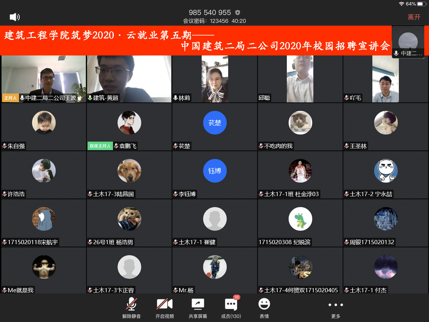 为促进建筑工程学院2020届毕业生精准就业,同时引导2021届学生更好确定就业方向和目标,受建工学院院长林莉和土木工程专业系副主任卢书楠邀请中国建筑二局二公司经理王波、毛伟良以及中国建筑二局二公司苍狼学院院长邱聪于4月29日上午9点做客“筑梦2020·云就业”第五期,开展专场招聘宣讲会。专场招聘宣讲会由我院2020届毕业班辅导员黄超主持。