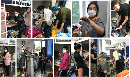 上午8点,全体教师分为8个小组,通过测温登记进入学生公寓,通过视频连线毕业生,与同学们进行了“云见面”,全程以视频直播连线的方式与学生交流,按照每一位同学的要求将所需物品进行分类收纳整理,将每件物品都一一地和毕业生进行确定是否邮寄。尽管毕业生的行李物品非常琐碎,整理一个学生的物品需要2-3个小时,但老师们都像对待自己孩子一样,认真细致的为每位毕业生整体物品,事无巨细,从书籍、衣服到学生证、钥匙串,每一件物品都仔细核对,保证没有被遗漏。老师们额头上的汗水、布满灰尘的双手、亲切的话语,让视频另一端的学生深受感动,四年前,我们接过了你们的行囊,四年后,我们为你们整理行装。疫情隔断了距离,却割不断法学院与每一位同学的情谊。
