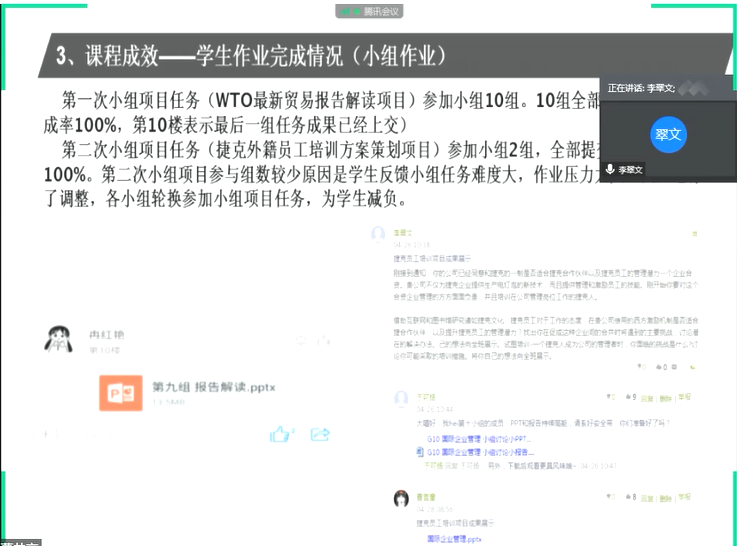 经济管理系李翠文老师主讲的是双语课程《国际企业管理》,她说在课前给学生发布明确的课程指引,比如课程的教学目标、课堂内容的时间分配、需要完成的课程任务等,使学生高效有序的完成学习任务。在教学过程中,李翠文老师利用精彩的案例将抽象的问题形象化、将复杂的问题简单化,组织严谨,思路清晰。通过创造轻松和谐的课堂气氛激发学生的学习兴趣,运用启发式的教学方式鼓励学生积极参与课堂教学。她流畅的中英文表达深深感染了观摩的每一位老师。