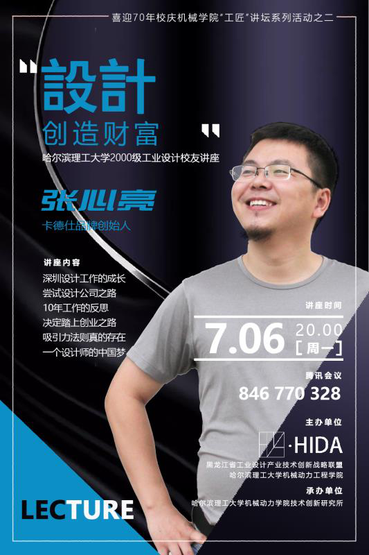 为庆祝我校建校70周年,机械动力工程学院联合黑龙江省工业设计产业技术创新战略联盟,举办“工匠”讲坛“工业设计”系列讲座。2020年7月6日晚8时,我院邀请2000级工业设计专业毕业生、现卡德仕品牌创始人张心亮先生通过腾讯会议,围绕“设计创造财富”的主题,以一个走上创业之路的设计者的身份,与我院学生及省内相关企业的工业设计人员,分享自己创业的心路历程。