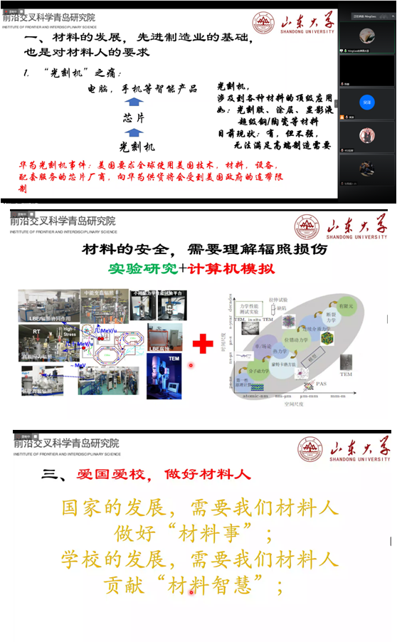 学术讲座由无机非金属材料系主任吴泽主持。讲座开始前,石德全副院长代表学院对高宁教授表示热烈欢迎,并感谢高宁教授在百忙中通过线上为我校师生做学术讲座,把自己多年来的专业经验、工作积累分享给师生们。高宁教授回顾了自己学习和研究的历程,激励学弟学妹们刻苦学习,锻炼自主学习能力;介绍了我国当前制约技术进步的材料方面的问题,鼓励学弟学妹们为国建功;重点讲述了核能材料的实验及计算模拟方法。