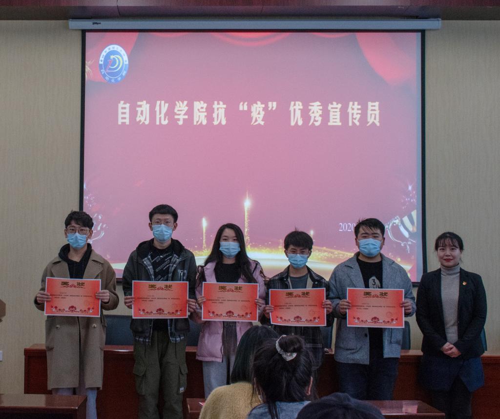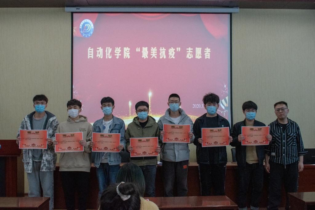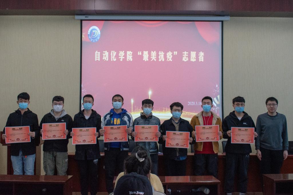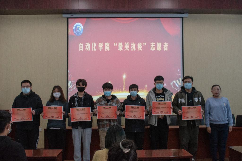 随后,党委副书记艾荻、团委书记黄林萱、19级机器人专业辅导员张戈、19级自动化专业辅导员谢桂花、自动化学生会指导教师付宇为“最美抗疫”志愿者颁发了战疫志愿者证书,并合影留念。