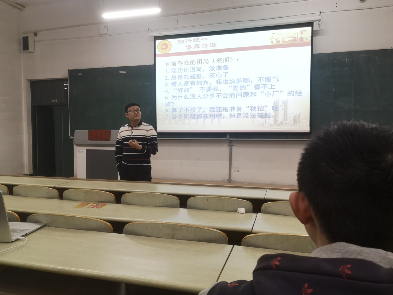 随后,学院学业发展与就业指导中心刘鸿图做了“就业方向破局辅导”。辅导分析了目前学生中普遍存在的7个问题困扰和3类思维误区,强调要打破现有“时空角”,跳出“舒适区”,通过实践认识外部世界,学会面对问题和调整自我定位,利用实习生招聘过程探索适合自己的行业和岗位,帮助自己在简历、专业知识与项目储备、面试三个重要环节做好准备,为9月份开启的校园招聘做好充分准备。