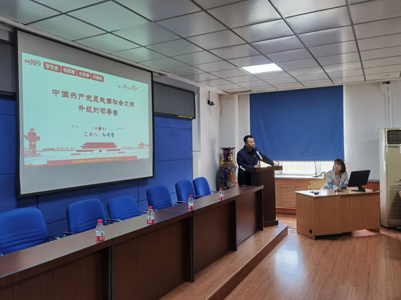 院党委书记张桂玲老师上台为本次会议致辞,随后孙明哲教授上台通过引用习近平总书记的讲话提出了本次报告的三个主要内容:“社会的发展是人类文明的进步”,“中国共产党成立的历史必然性”,“马克思主义指导思想的历史必然性”,并从这三个主要方面为大家带来了学习报告。
