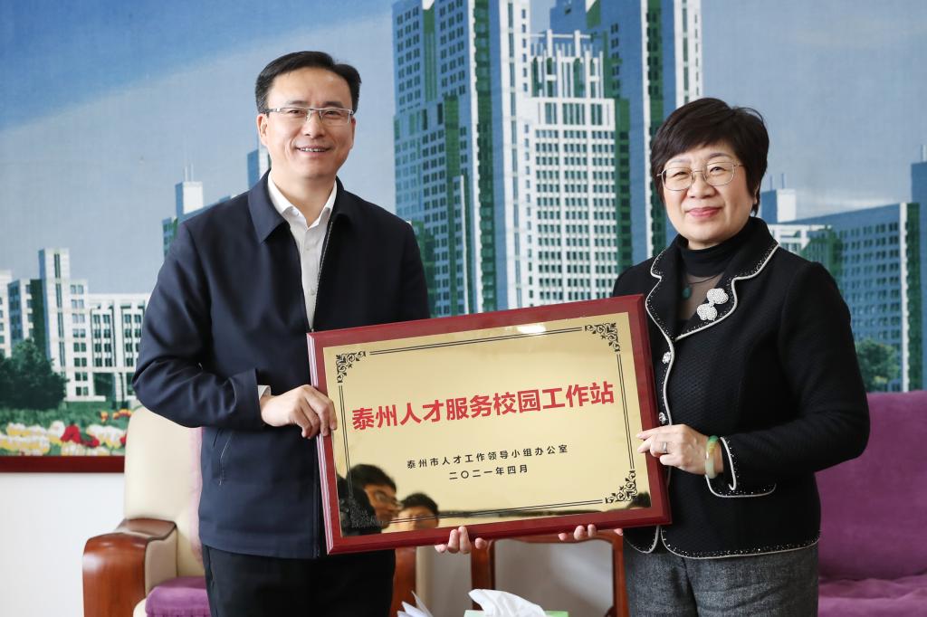 认真听取介绍后,鞠林红部长表达了泰州市组织、人社部门与我校共建人才基地的意愿,介绍了泰州市的基本概况和近年来的产业发展情况。他指出,泰州市重点扶持的生物制药、高端装备制造、精细化工和新材料三大主导产业与我校重点学科关联度较强,所需人才与我校学科专业匹配度非常高,泰州市将组织部分重点骨干企业赴我校开展专项引才活动,同时欢迎学校领导、老师和同学们到泰州市实地考察交流并开展就业实践活动。泰州市人才工作领导小组办公室在我校建立“泰州人才服务校园工作站”,并举行了授牌仪式,同时聘请我校大学生就业指导中心崔征老师为泰州市“引才大使”。