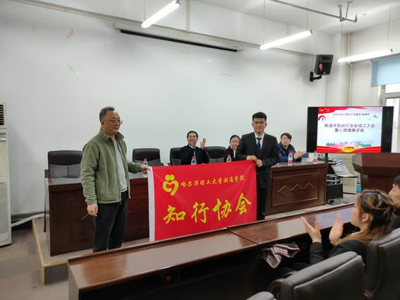 校大学生心理健康教研室主任吕彬江老师为知行协会授旗