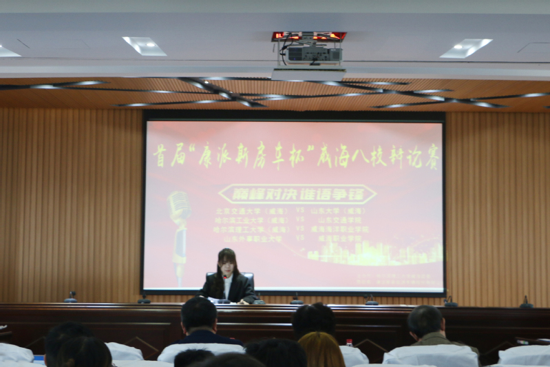 首先,孙晶老师致开幕辞。随后,比赛正式开始。本次比赛有山东大学(威海)、哈尔滨工业大学(威海)、北京交通大学(威海)、哈尔滨理工大学荣成学院、山东交通学院、山东外事职业大学、威海职业学院、威海海洋职业学院等八所驻威院校参加,分为初赛、复赛、决赛三个环节。八支代表队抽签决定对战的正反方,比赛获胜者晋级,落败者直接淘汰。上午的初赛阶段各参赛队伍围绕人与自然的和谐相处、人文情感、自媒体等辩题展开了激烈辩论,选手们展现了优秀的思辨能力及从容镇定的状态。辩论场上涌现出许多“铁齿铜牙”,正反双方引经据典,你来我往,各参赛团队表现出良好的竞技状态和专业水平。经过一番唇枪舌剑,哈尔滨工业大学(威海)、山东大学(威海)、哈尔滨理工大学荣成学院、威海职业学院四支参赛队伍胜出,进入下午的复赛环节。