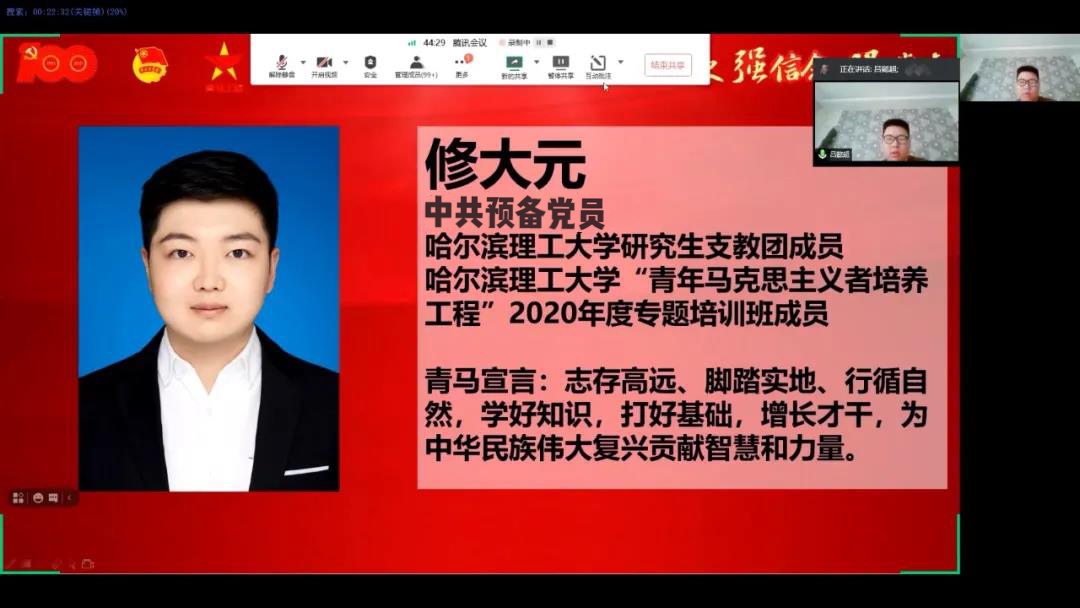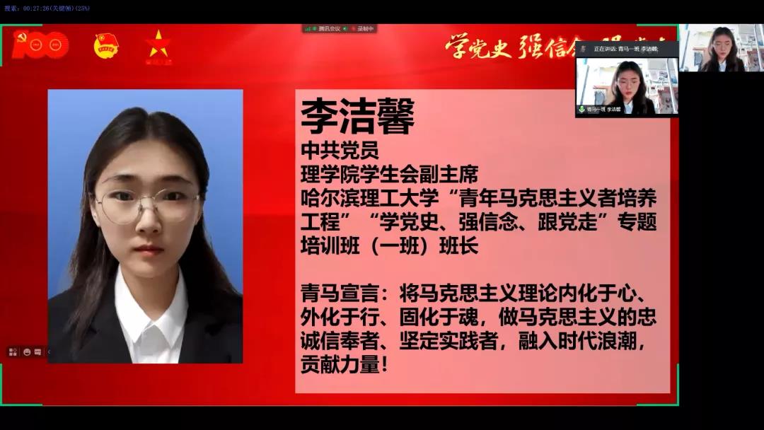 为引导青年学生进一步坚定理想信念,全面提升大学生骨干的综合素质,我校团委积极响应团中央、团省委和学校党委的号召,以建党100年为契机,以加深学员对党史的了解与认识,学深悟透习近平新时代中国特色社会主义思想,掌握马克思主义的思想方法和工作方法,进一步坚定跟党走中国特色社会主义道路的信心和决心为出发点,按照疫情防控要求,于2021年5月21日(星期六)17时借助腾讯会议app线上召开了哈尔滨理工大学2020年度“青年马克思主义者培养工程”培训班结业式暨“学党史,强信念,跟党走”专题培训班开班仪式。2020年度“青马工程”培训班优秀学员代表、“学党史、强信念、跟党走”专题培训班学员及校青年发展规划中心工作人员等近150人参加本次活动,仪式由本次“青马工程”专题培训班副班主任吕懿超老师主持。