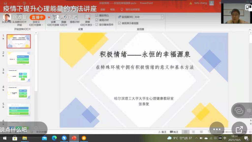 2021年10月5日,在第30个世界精神卫生日来临之际,疫情常态化背景下,为宣传普及心理保健知识,深入开展心理健康教育,由我校心理健康教研室承办的世界精神卫生日系列讲座通过线上直播的方式举行。本次系列讲座的第一讲主题为“积极情绪——永恒的幸福源泉”,由我校心理健康教研室专任教师、国家二级心理咨询师张泰复副教授主讲。