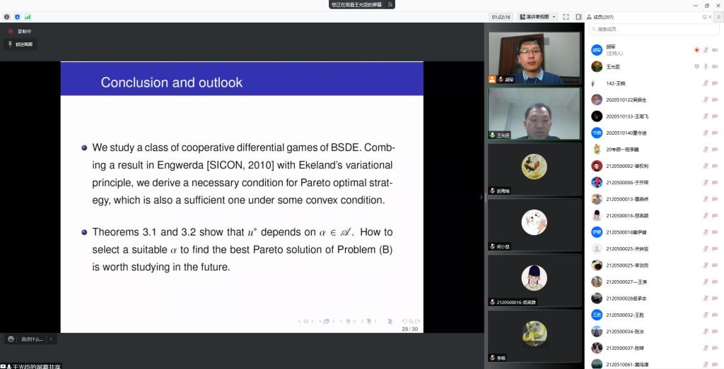 王光臣教授在报告中重点分享了倒向随机微分方程、合作博弈、Pareto最优策略等前沿热点问题。讲述了倒向随机微分方程相较于正向随机微分方程的不同和优势,详细介绍了Pareto最优化的数学含义、研究动机和相关研究工作,对研究倒向随机微分方程的Pareto最优化问题遇到的困难和相应的解决方法进行了简要的讲解,并通过一个金融领域的实例形象地展示了Pareto最优化策略是如何应用和实现的,以及使用Pareto最优化策略可以有效地避免一些投资风险,强调理论基础的重要性和研究问题的严谨性。师生提问互动环节,王光臣教授对指标泛函中指数函数的含义、由倒向随机微分方程驱动的合作博弈优化控制的优势、以及倒向随机微分方程存在解析解的前提条件等问题给出了细致的解答,与会师生受益匪浅。
