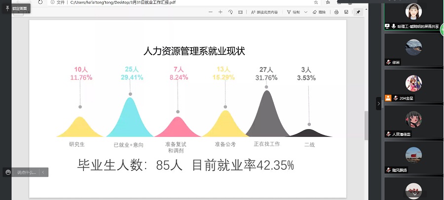 周长群在讲话中强调,虽然毕业生就业形势严峻,但近年来学校通过构建高水平的人才培养体系、高质量的就业创业指导服务体系和高效率的协同保障体系,有效推动了毕业生充分高质量就业。面对今年的困难形势,学院希望家长共同配合努力,为孩子开辟更美好的未来。要做好因准备考研而未择业学生的就业动员工作,择业和考研并重,对未就业学生做好就业观念的引导工作,动员学生主动择业,放宽就业视野。同时,也要积极配合当前的疫情防控工作,注重个人防护。