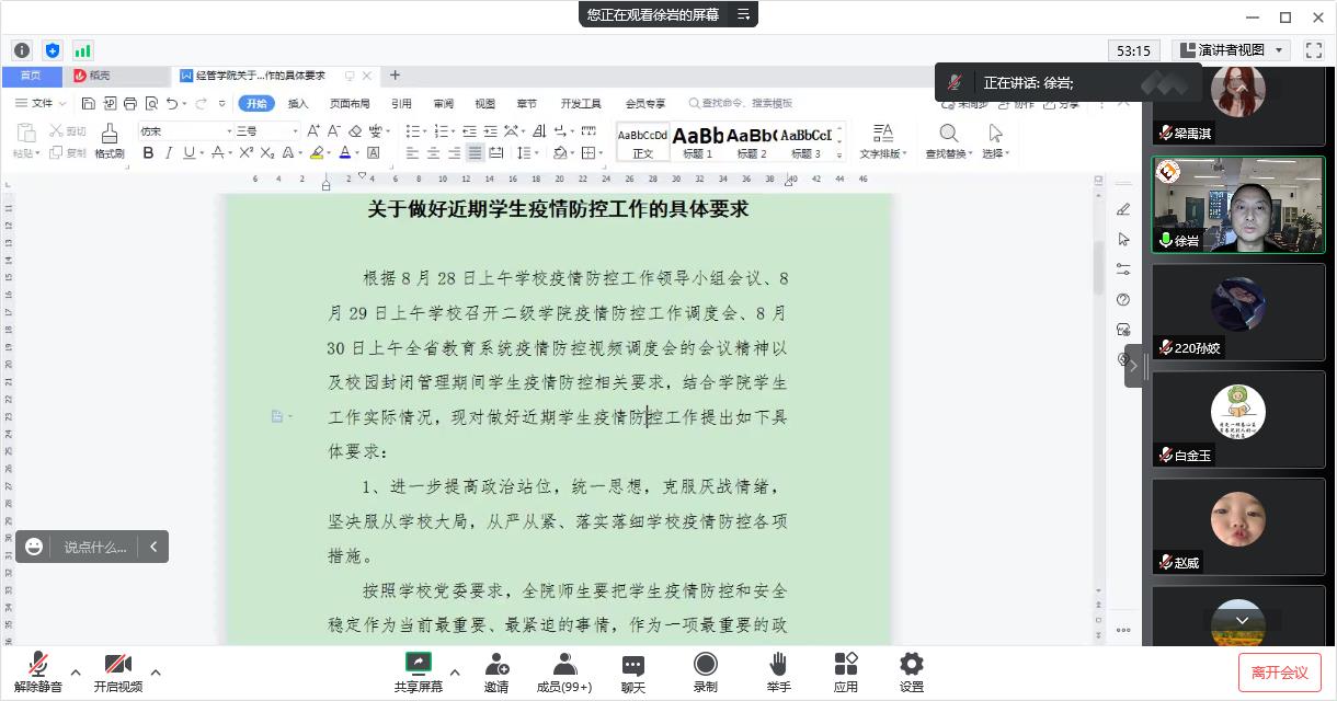 为落实学校疫情防控总体要求,提高学生安全意识,进一步加强返校学生管理工作,严防校园疫情输入,9月3日晚,经济与管理学院召开秋季学期返校学生安全教育会。学院党委副书记兼副院长徐岩、全体辅导员和158名返校学生线上参会。会议由学院学生工作办公室主任张智洪主持。