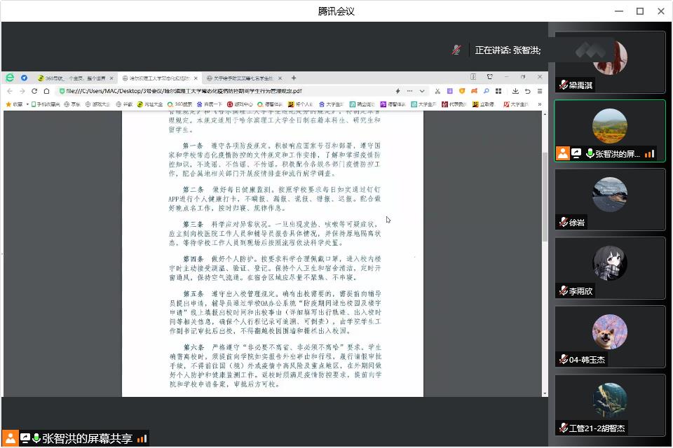 会上,张智洪领学了《哈尔滨理工大学常态化疫情防控期间学生行为管理规定》,分析违纪学生典型案例,以案明纪,告诫同学们当前疫情形势仍然严峻,返校后应积极配合学校、学院疫情防控工作,自觉遵守相关防疫要求,密切关注自己旅居地的疫情变化,切勿违规违纪。同时要求已返校的学生每日向辅导员老师如实上报自己的健康状况,叮嘱同学们认真做好个人防护。