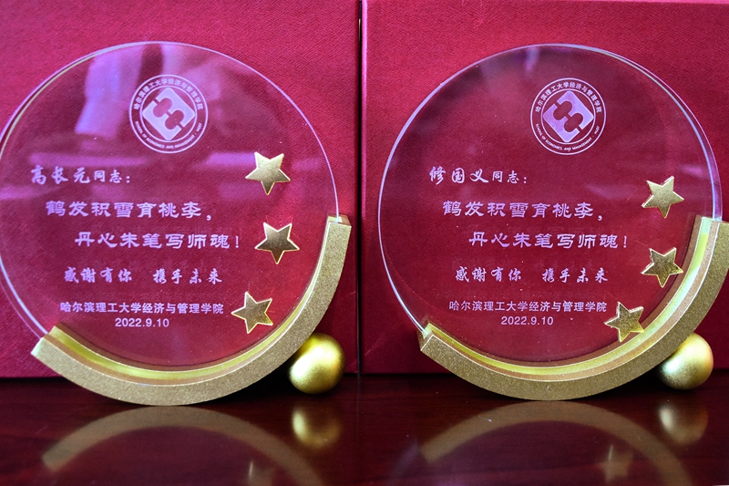 院长武建龙、副院长姚锋敏为修国义教授、高长元教授颁发荣退教师纪念牌
