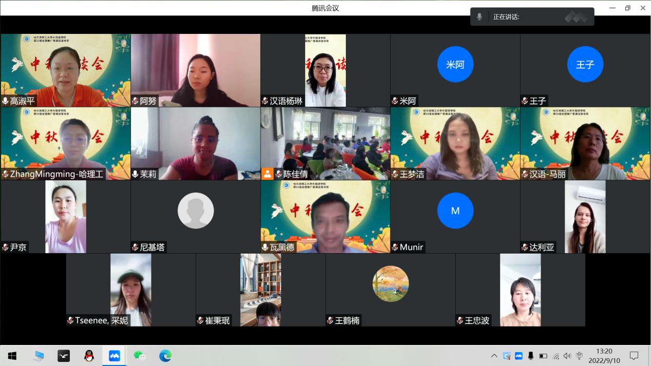 9月10日,既是中国的传统佳节中秋节,也是一年一度的教师节,外国语学院为目前在校的全体学生、境内外来华留学生组织了一场线上线下同步的“中秋诵读会”。外国语学院全体领导班子及对外汉语系教师参加了此次活动。