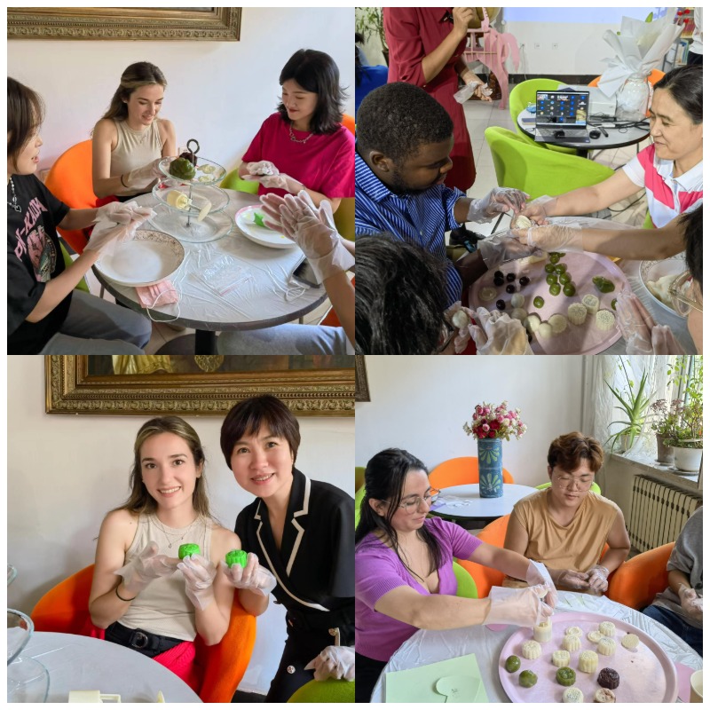 接下来,老师们把做月饼的食材与模具分发给现场的学生们,大家一起亲手制作中秋月饼。来华留学生与中国学生互帮互助在欢声笑语中共享象征着团圆与美好的冰皮月饼。此时,线上直播观看与互动的留学生们都纷纷表示了羡慕与期待。