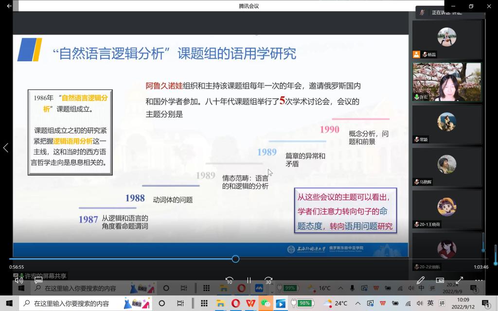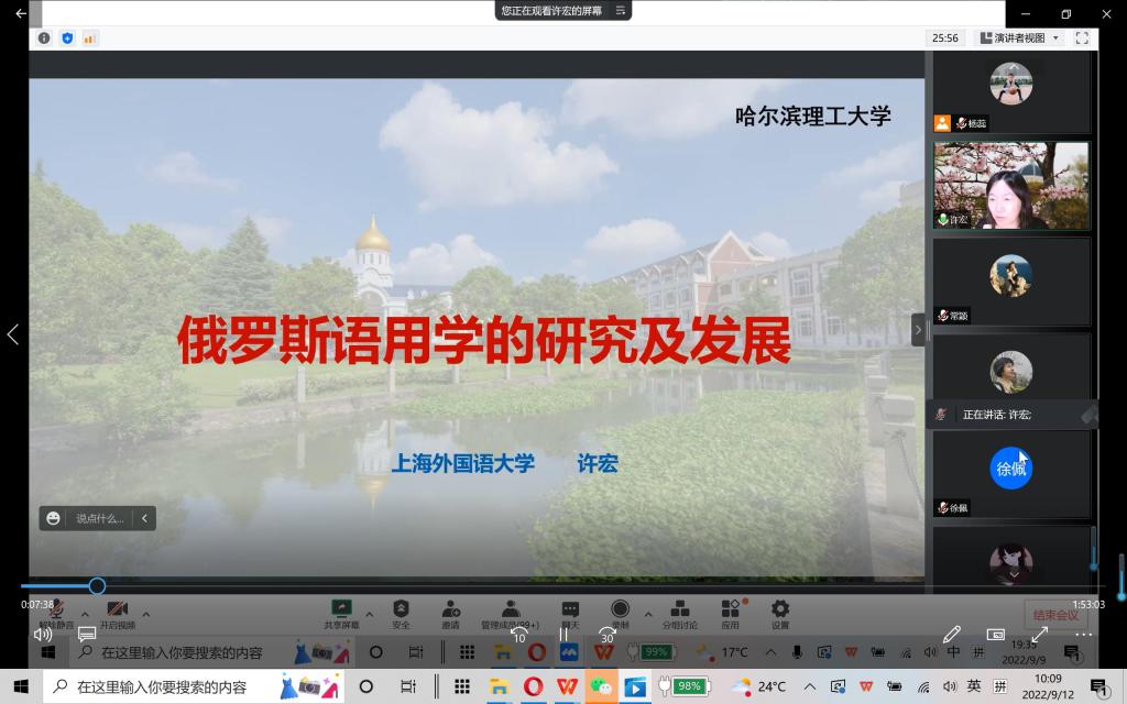 作为国内俄罗斯语用学研究的领军人物,许宏教授系统梳理了俄罗斯及国际语用学的产生、发展及研究动态:指明语用学与哲学之间密不可分的关系;强调指出,除了特定的哲学背景之外,现代语用学的形成也是与语言学本身的发展密切相关的,20世纪以来,语言学界接连发生了两场“革命”——“历史比较语言学”的革命和乔姆斯基革命;对“自然语言逻辑分析”课题组的语用学研究进行讲解;并结合自身《时政文献外译的词汇策略研究》、《俄语政治语篇中元话语修辞劝说功能的构建——以普京2019年国情咨文语篇为例》等成果阐明当前语用学研究的热点及前沿问题。