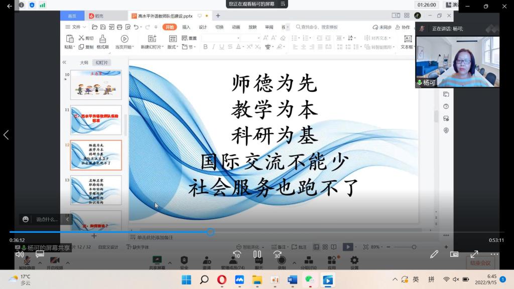 9月14日18时,为持续提升导师育人和指导能力,不断提升研究生培养质量,在学校研究生处指导下,外国语学院成功举办硕士研究生导师培训系列讲座。学院邀请广东外语外贸大学杨可教授,做主题为《高水平外语教师队伍建设实践与思考》的讲座。院长马艳辉、全院硕士研究生导师等70余人参加学习,副院长杨蕊主持讲座。