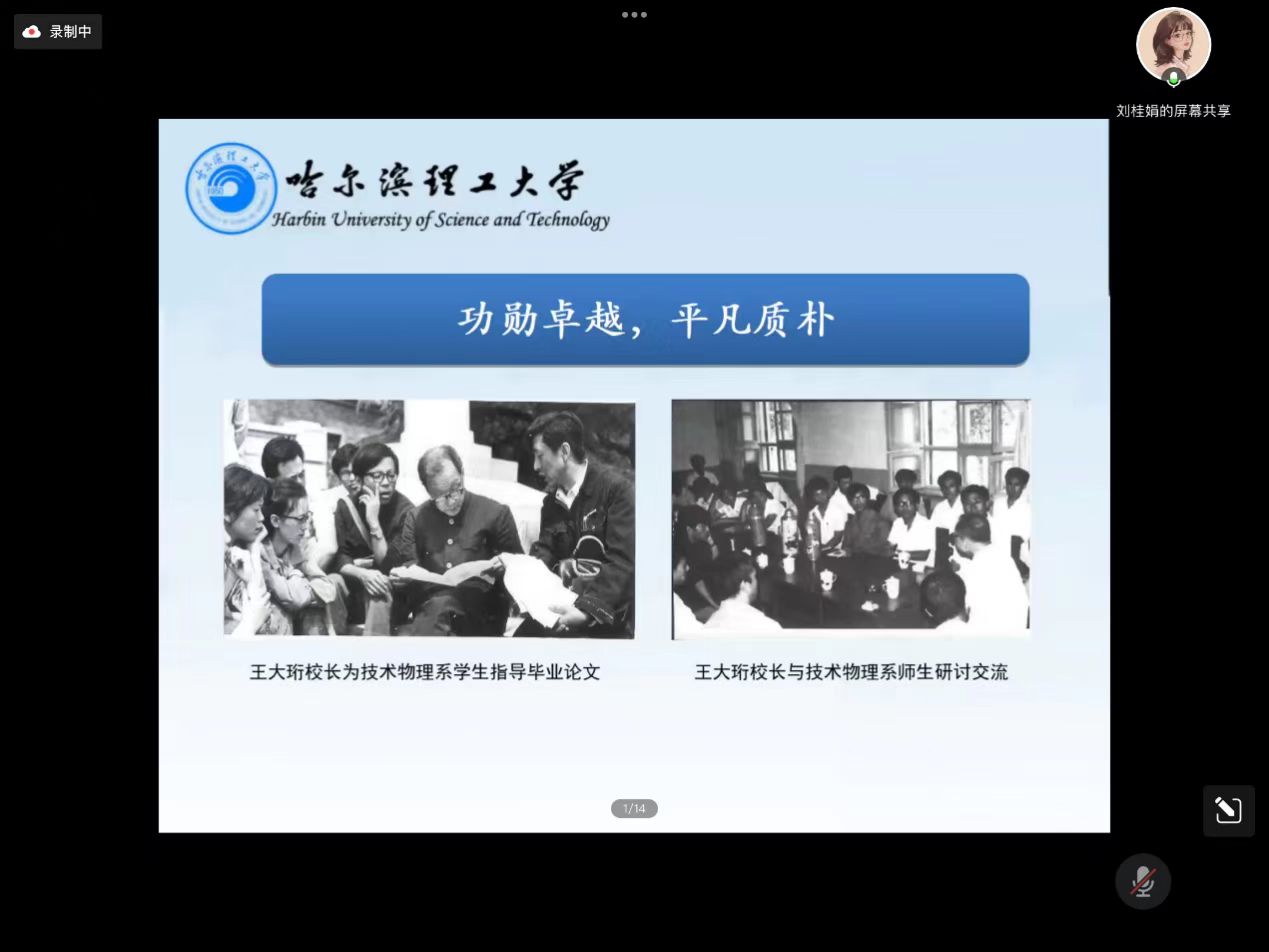 讲座过程中,刘桂娟老师从王大珩先生光辉的一生、王大珩先生与哈尔滨理工大学、“大珩精神”的理工传承等三个方面向大家进行细致分享。首先,刘桂娟老师向全体学生介绍了什么是大珩精神,即忠诚祖国、献身科学、淡泊名利、寻优勇进。理学院是大珩精神的发源地,是我们理学院的灵魂和骄傲。讲述了老校长王大珩先生为学习先进科技知识努力求学,艰苦奋斗的生平以及事迹。同时介绍了王大珩先生来到哈尔滨理工大学的前身哈尔滨科技大学任职,任教期间指导学生完成毕业论文等感人故事,展现了王大珩先生功勋卓著,但拥有着平凡质朴的高尚品质。讲座过程中,刘桂娟老师伴随着时间线带大家去了解王大珩先生的一生,接着为学生们介绍了校园红色地标王大珩铜像与王大珩院史馆、“大珩宣讲团”“大珩志愿服务队”“大珩读书社”“大珩话剧社”等理学院特色品牌项目,掀起“讲好红色故事、传承红色基因”的学习热潮。最后,刘桂娟老师激励全体新生要牢记王大珩先生对青年学生要有“献身的精神,求实的态度,革新的气质,勤俭的作风,集群的性格,乐观的情绪”的期冀,学习和传承王大珩先生的优秀品质,继承和发扬“大珩精神”。