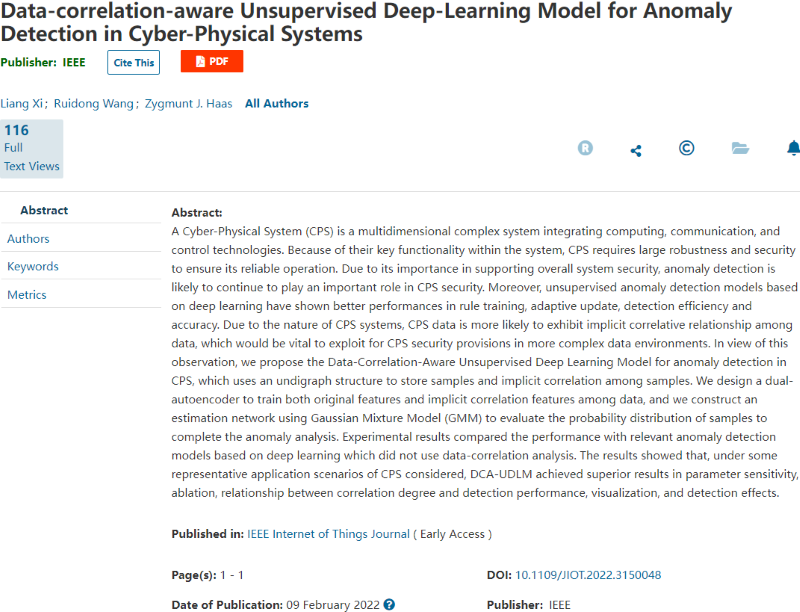 论文《Data-correlation-aware unsupervised deep-learning model for anomaly detection in cyber-physical systems》是席亮副教授在美国访学期间与美方合作导师Zygmunt J. Haas教授(IEEE and ACM fellow)克服种种疫情带来的困难共同完成的论文。该论文重点研究下一代物联网——信息物理系统复杂数据环境下的安全问题,通过深入挖掘数据隐含的关联特征来提升信息物理系统的异常检测性能。
