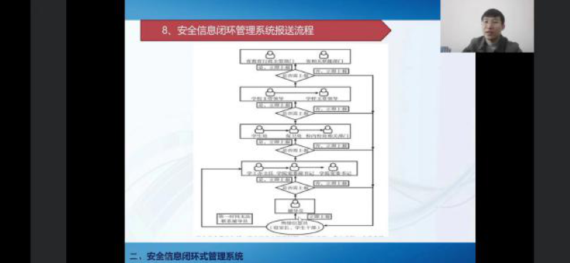 会议开始,石金永老师就培训的主要目的及重要意义向大家进行了说明,强调了学生安全信息员队伍建设在校园安全工作中的必要性和重要性。主要从高校学生安全稳定面临的形势、安全信息闭环式管理系统介绍、安全信息闭环式管理系统发挥的作用三个方面进行了讲解,使信息员明确的了解了影响学校安全的因素,时刻保持警惕,并提示各位信息员要严格按照工作细则提示进行日常管理工作。此外,石金永老师还对施行安全信息闭环管理系统应掌握的相关电话、涉及内容、报送形式、报送原则、报送机制、报送流程和如何进行信息研判进行了详细讲解,使安全信息员掌握了安全闭环系统的相关内容、明确了自己的职责、掌握了危机事件处理程序,在发生安全问题时能迅速、准确的按照程序进行上报,真正当好辅导员的“千里眼”“顺风耳”,为学生宿舍的安全问题保驾护航。