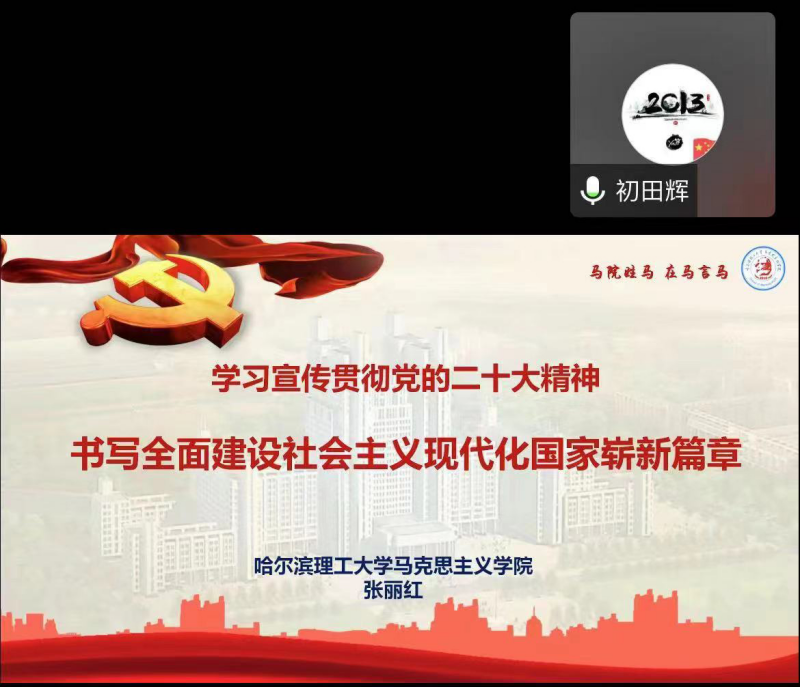 张丽红老师本次宣讲的主题是《学习宣传贯彻党的二十大精神书写全面建设社会主义现代化国家崭新篇章》。图书馆党支部书记、副馆长靳添博主持会议,馆长初田辉发表讲话,图书馆全体工作人员以线上会议的形式参加宣讲报告会。