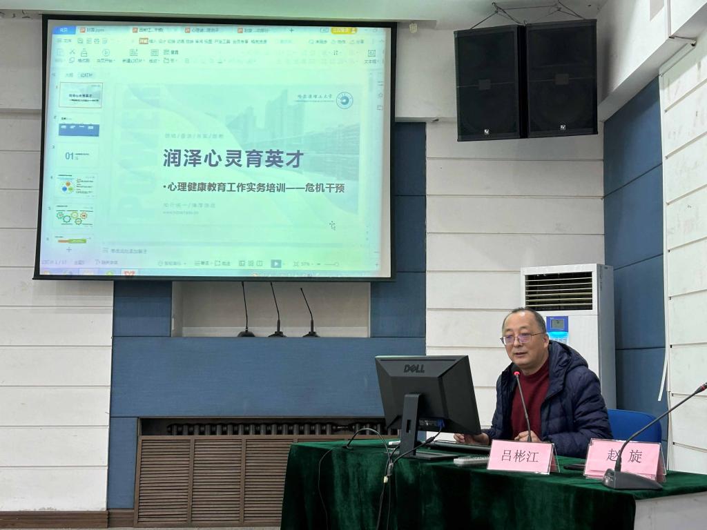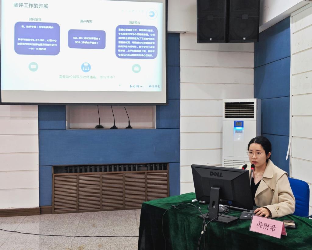 培训分为三个部分。首先,心理健康中心主任吕彬江老师从“心理健康工作介绍、心理普测和排查、谈心谈话相关要求、危机干预家校合作”四个方面开展了以“润泽心灵育英才”为主题的培训。吕老师强调,心理健康工作是一份充满爱与责任的工作,各位老师在工作中应当把对学生的关爱融入到心理健康教育中。其次,心理健康中心专任教师赵旋老师从“心理健康宣传活动的开展、心理功能室的预约与使用、心理委员的选拔与培养”三个方面开展了以“心育助力、阳光护航”为主题的培训。赵老师强调了心理健康宣传活动的开展要求,并对第十七届心理健康活动月的活动安排做了细致讲解。最后,心理健康中心专任教师韩雨希老师从“测评工作的开展、测评系统的使用、测评结果的查看、系统附加功能”等五个方面开展了以“关怀自己、守卫他人”为主题的培训。韩老师细致的讲解了心理普查与测评工作中需要运用的专业技术,例如:系统的操作流程、测评结果的研判与分析等,设置了现场答疑环节,给各位老师的普测工作提供了有力的技术支持。