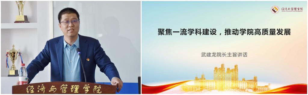 武建龙指出,通过经管学院几代人努力,现已建成涵盖本、硕、博、博士后完备的经管类学科体系,近几年学院学科建设经费显著增长,得益于学院完备的学科体系和学科建设成效,这充分表明以学科建设为导向是推动学院高质量发展的必然战略选择。他强调,科学研究是建设国内一流经管学院的核心使命,是一流学科建设的核心内容,更是提升我院竞争力和影响力的核心力量。学院将全面落实学校“科研先行”的重要部署,开展有组织的科研,围绕学科方向组建一批高水平科研团队,争取国家级重大项目,争取在国家级人才形成突破,致力于将省级人文社科重点研究基地和省级智库打造为科研高地。他指出,学院将继续深化本硕博一体化人才培养体系建设,推进工商管理类本科大类招生和大类培养,以数字化、标准化、国际化、模块化推进人才培养方案动态重构,以学科建设为支撑系统推进高质量人才培养。