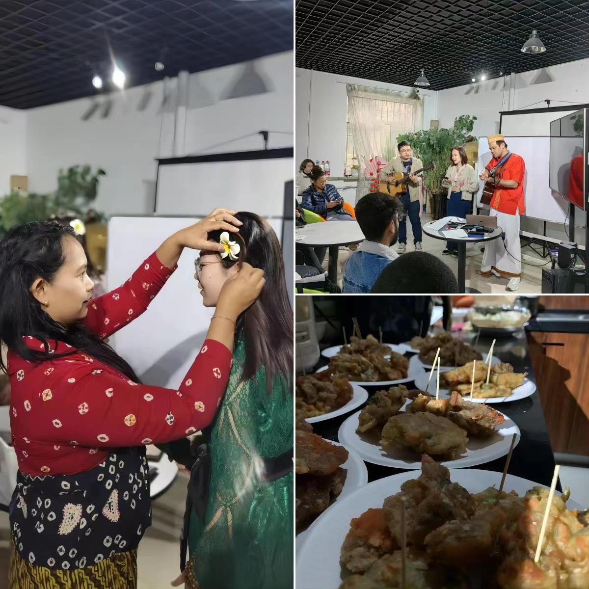 印尼同学们设计了丰富多样的互动游戏和体验环节,味道浓郁的印度尼西亚饭菜Cireng、Bakwan、香蕉蛋糕等美食也征服了中国学生的味蕾,让大家感受到了异域的风味;女同学穿上了巴厘岛的新娘服饰,一起体验巴厘岛婚礼的浪漫。《Indonesia tanah air beta》的音乐掀起了活动的高潮。