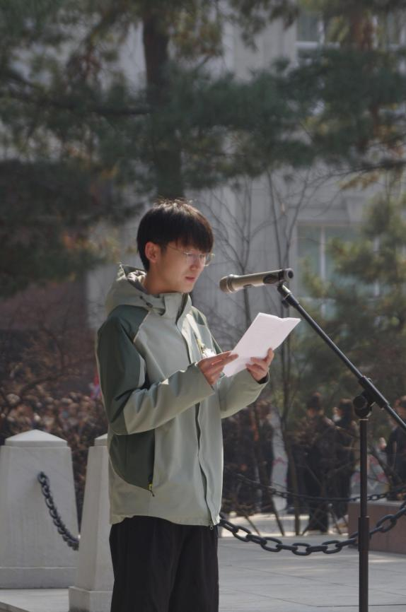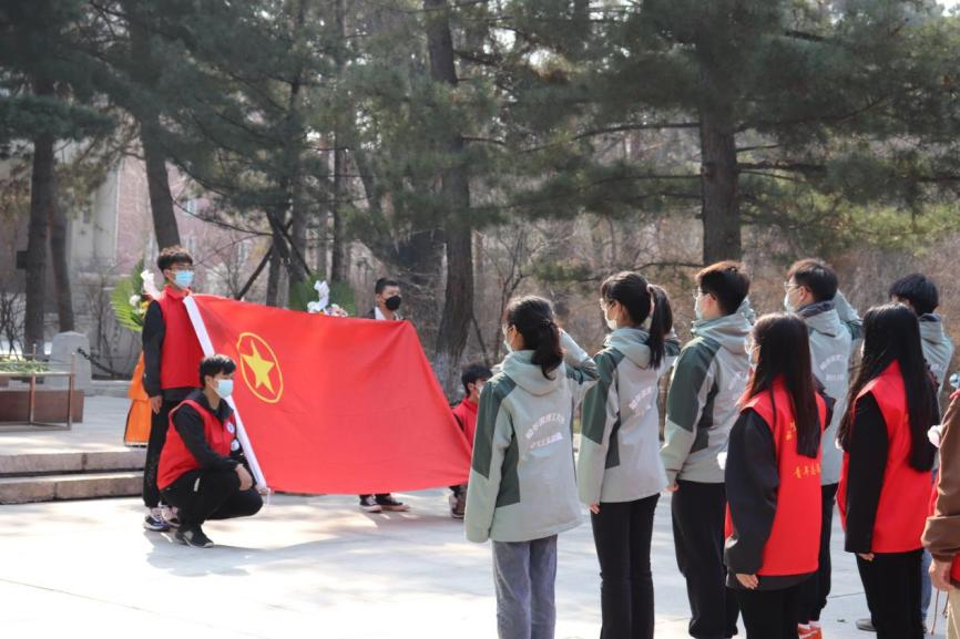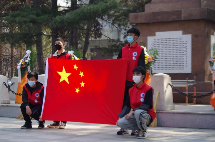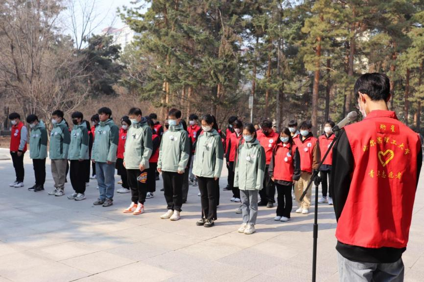 4月2日清晨,“珩星”志愿服务队的40多名志愿者们穿着整洁,队列整齐,来到老校长王大珩先生的雕像前,敬献菊花并深深三鞠躬以表示深切缅怀。志愿者们带着深沉的哀思和无尽的怀念,精心地清扫王大珩雕像及其周围场地。随后志愿者们前往哈尔滨烈士陵园,陵园庄重而肃穆,主持人怀着沉重的心情向革命先烈致以最崇高的敬意。当铿锵的国歌响起,志愿者们面对着五星红旗,全程肃立,奏唱中华人民共和国国歌,那些慷慨激昂的歌词记录的是曾经英烈们英勇斗争的历程,承载着无数不朽的历史与信念,歌声嘹亮响彻整座陵园。以山为灵,以木为魂,全体志愿者向烈士们献上菊花,送上问安,致敬英雄。朵朵菊花,象征着他们心灵的纯净无瑕,象征着他们崇高的品质和无私的精神。缕缕春风,说不及对革命烈士的无限深情,道不尽对烈士英魂的无尽哀思。全体志愿者怀着深切悼念和无限哀思闭眼默哀三分钟,追忆烈士们为如今繁荣祖国做出的不朽贡献。在这三分钟的沉寂中,时间也仿佛凝滞为永恒,整个陵园能感受到的唯有同学们流动着的哀思与跳动着的爱国热情。默哀结束后,由校团委学生志愿服务中心代表与研究生支教团代表进行发言,表达对烈士们的敬意与怀念,也表达作为新时代青年对未来的决心与信念,青山埋藏着忠骨,烈士们的丰功伟绩将永存史册。崇尚英雄才能产生英雄,争做英雄才能英雄辈出。志愿者全体举起右手面对着团旗,跟随着领誓人庄严宣读入团誓词,声如洪钟,铿锵有力的誓词回荡在整个烈士陵园。最后青年志愿者们分头对陵园全域进行卫生服务,清理可见垃圾,对烈士墓碑进行扫尘、擦拭。