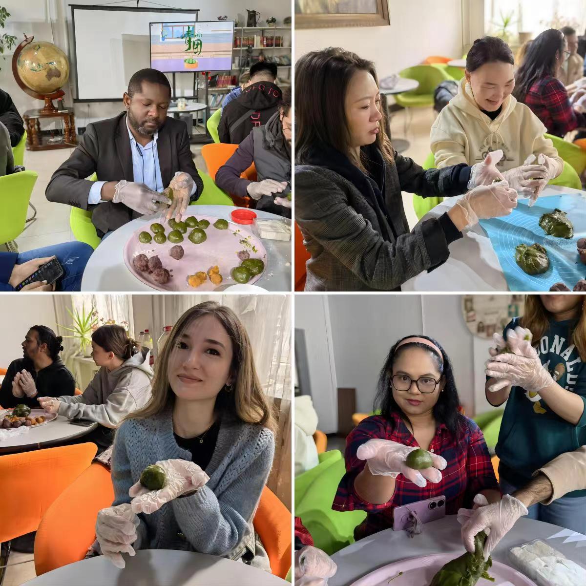 活动伊始,张明明老师向留学生们介绍了清明节的起源、背景、习俗、传统食品和相关汉语词汇等,带领留学生们诵读并赏析了唐代诗人杜牧脍炙人口的诗歌《清明》并一起制作了“软软糯糯”的青团。