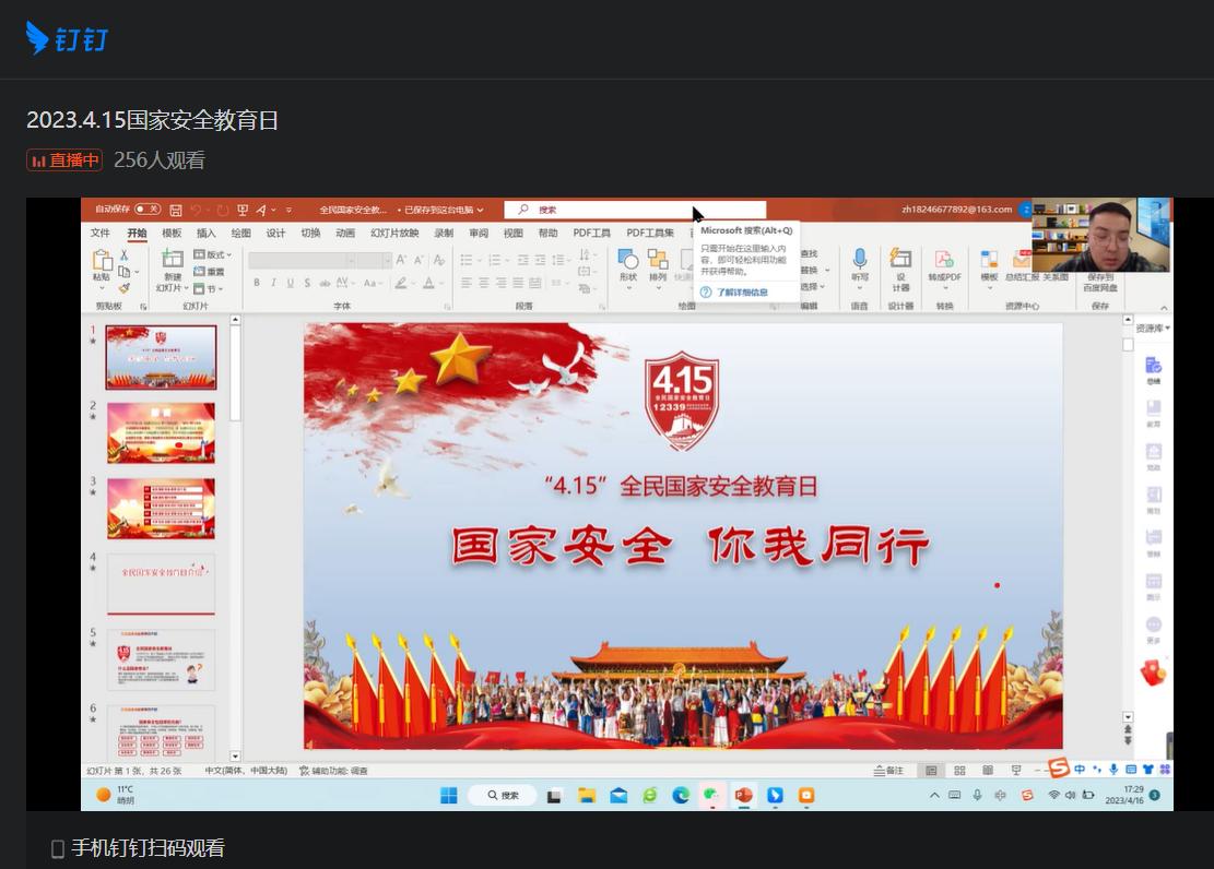 为营造“国家安全,人人有责”的浓厚校园氛围,筑牢维护国家安全和社会政治稳定的思想基础,2023年4月16日外国语学院本科辅导员贾昊鹏老师采用钉钉线上直播的方式开展了“国家安全,你我同行”主题安全教育大会。会上向同学们普及宣传国家安全知识,增强国家安全意识,教育外国语学院学生要自觉维护国家安全、履行保守国家秘密的义务,用实际行动践行社会主义核心价值观。