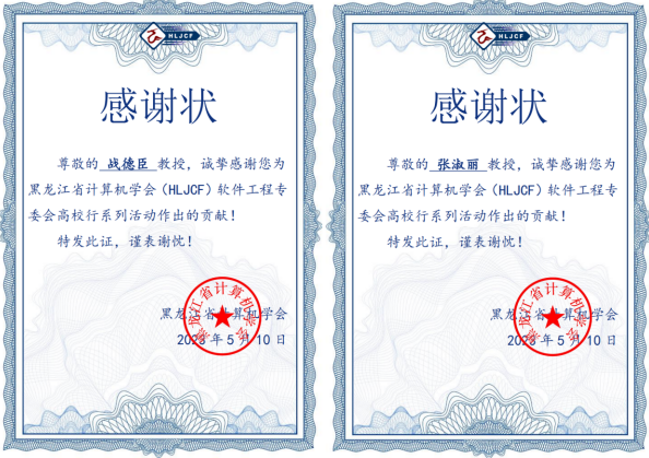黄海院长分别为战德臣教授、张淑丽教授颁发了感谢状,感谢两位教授对HLJCF软件工程专委会高校行系列活动作出的贡献,他强调,第二届黑龙江省计算机学会软件工程专业委员会在新的一年,牢记初衷,铭记责任,通过交流互动,促进专委会委员教学与科研能力的大幅度提升;通过校企合作,促进我省软件及相关企业快速发展;通过教学改革,促进我省高校软件人才培养质量大幅度提升。