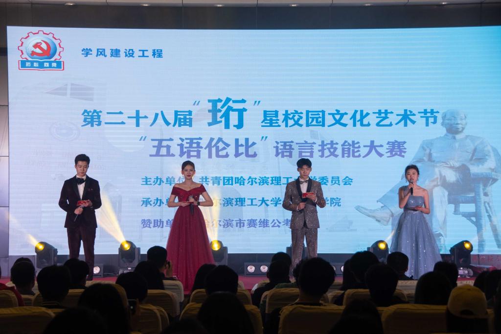为学习弘扬党的二十大精神,扎实推进习近平新时代中国特色社会主义思想主题教育,贯彻落实学校“珩心向党”党建品牌建设工作,进一步增强青年学生的思想和价值引领、拓宽学生国际视野、提升学生的语言应用能力和国际传播能力,5月12日18时,外国语学院团委、学生会在哈理工西区1号楼0220报告厅成功举办了第28届大学生文化艺术节暨“五语伦比”语言技能大赛。外国语学院党委书记顾大兴、党委副书记蔡野出席本次大赛;外国语学院团委书记马宁老师、英语系徐丹老师、日语系周广老师、俄语系徐玉伟老师、哈尔滨哈普电器技术有限责任公司外贸销售经理张皓维担任本次大赛的评委;外国语学院辅导员贾昊鹏老师为本次大赛组织指导教师。