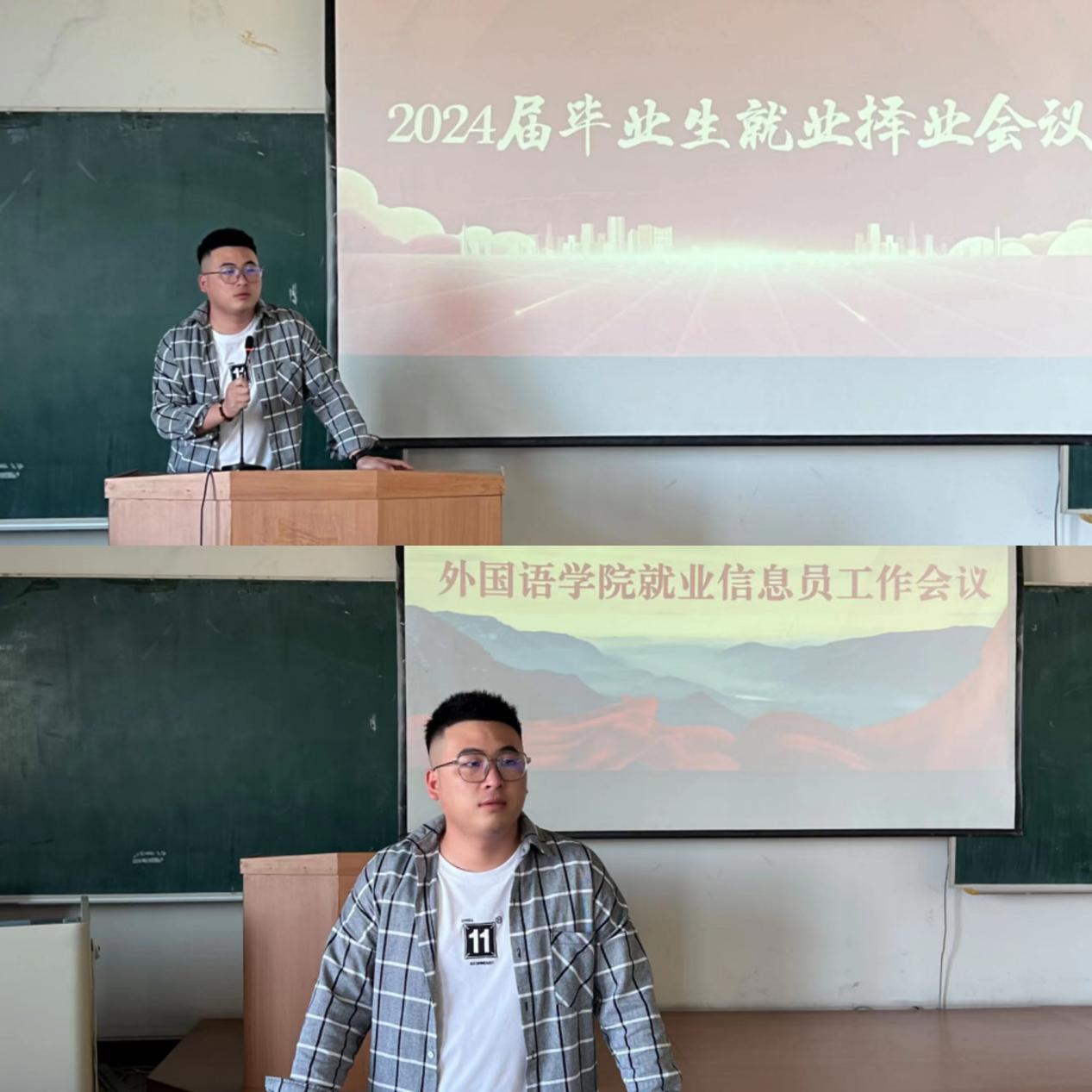9月6日,外国语学院于南区1号楼536教室召开2024届毕业生就业动员大会。外国语学院党委副书记兼副院长蔡野、外国语学院就业干事马宁参加本次会议并作动员发言,外国语学院2024届全体毕业生参会,会议由2024届本科毕业生辅导员丁鑫博主持。