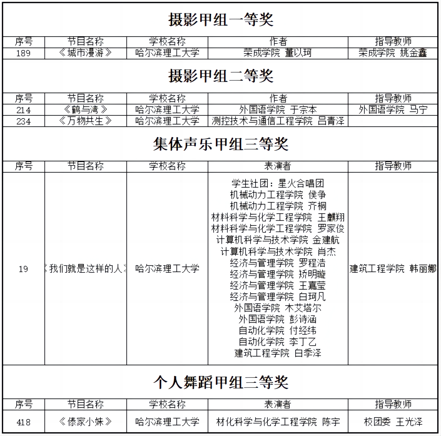 黑龙江省大学生艺术展演是我省规模最大的高校师生艺术展示和评选活动,每四年举办一次。本次活动由黑龙江省教育厅主办,以“厚植家国情怀,涵养进取品格”为主题。学校十分重视此次展演,指导教师对参赛作品进行全程把关,校艺术团成员以昂扬奋进的精神状态精心打磨节目。参赛师生用饱满热情在展演舞台上诠释了哈理工青年的青春梦想,充分展示了我校大学生追求艺术的渴望和勇敢拼搏的精神面貌。