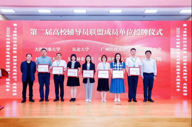 中国教育电视台高校辅导员联盟是由中国教育电视台在中宣部宣教局、教育部思政司的指导下,于2019年11月发起成立的辅导员联盟组织,我校和天津大学、吉林大学等39所高校入选首批联盟单位。联盟以凝聚力量、资源共享、立德树人、价值引领为宗旨,聚焦全国高校辅导员队伍建设,旨在为高校辅导员搭建沟通交流的平台,充分展示新时代高校辅导员的风采。2023年6月13日至16日,中国教育电视台高校辅导员联盟年会暨“奋楫笃行启新程,踔厉奋发建新功”主题培训活动,我校作为第二届联盟成员单位受邀参会,并参加授牌仪式。