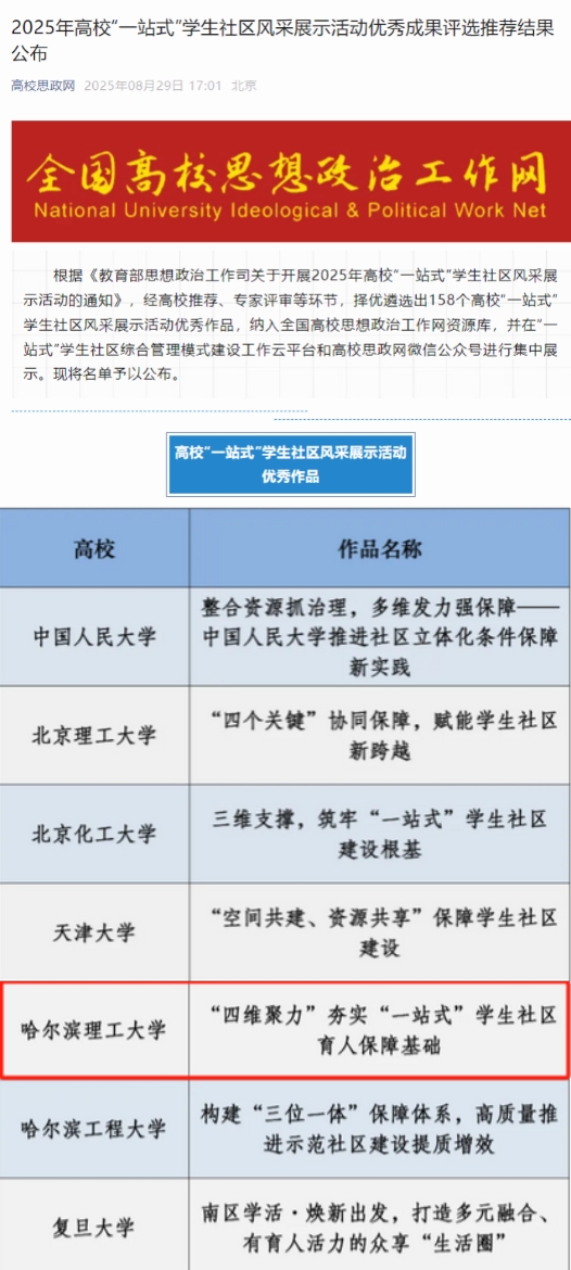 近日,教育部思想政治工作司公布了2025年高校“一站式”学生社区风采展示活动优秀成果评选结果。我校申报案例《“四维聚力”夯实“一站式”学生社区育人保障基础》获评本次风采展示活动“条件保障”模块优秀成果,我校成为黑龙江省两所入选高校之一。全国择优遴选出158个高校“一站式”学生社区风采展示活动优秀作品,纳入全国高校思想政治工作网资源库,在“一站式”学生社区综合管理模式建设工作云平台和高校思政网微信公众号进行集中展示。