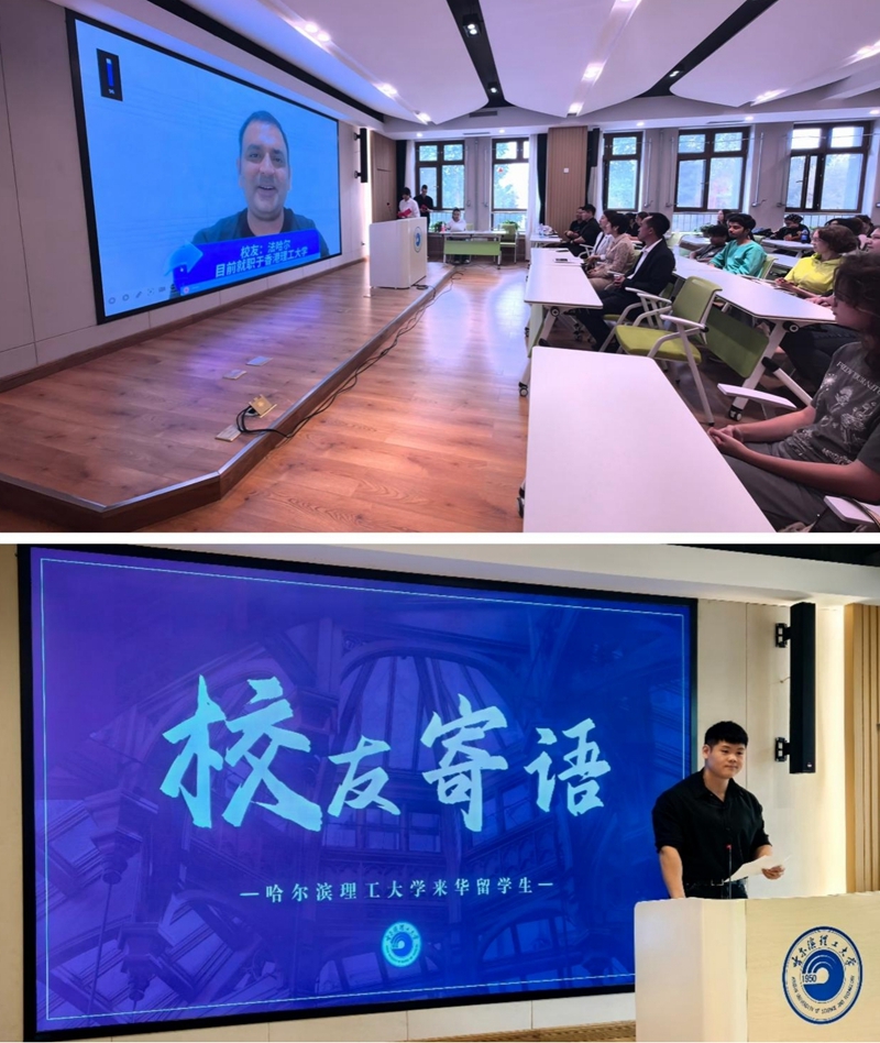 已经在香港理工大学就职的法哈尔学长通过视频送上祝福,博士就读于哈尔滨师范大学的姜东圭学长则亲临校园送来关怀,两位学长共同为学弟学妹们加油鼓劲。他们结合自身在求学、适应新环境过程中的真实经历,细致分享了如何快速融入陌生环境,真挚的话语和切实的建议让在场新生们倍感温暖与鼓舞。